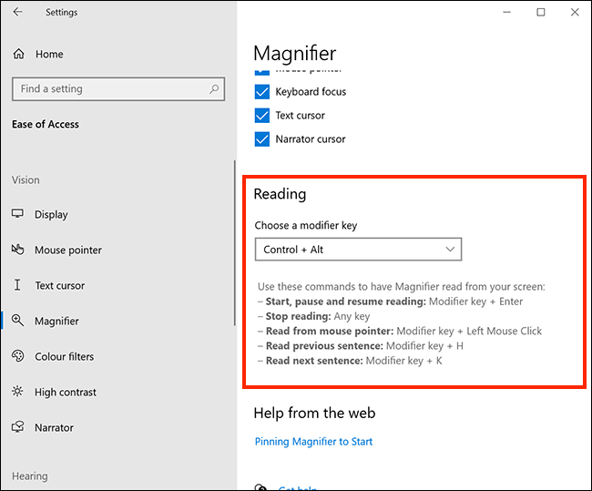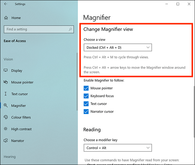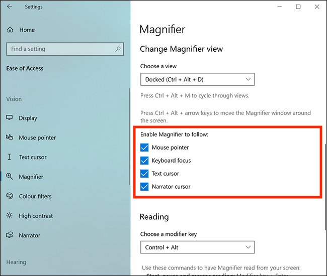- On the Magnifier settings page, curlicue downward to the Reading department.